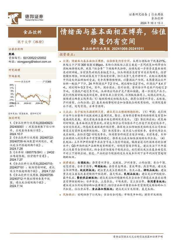 【德邦证券】【20241013】20241013-德邦证券-食品饮料行业周报:情绪面与基本面相互博弈,估值修复仍有空间-14页