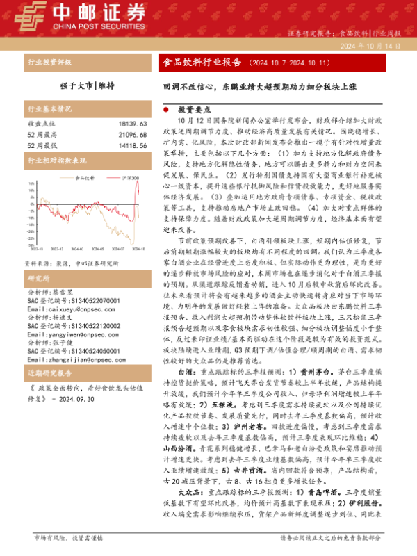 【中邮证券】【20241014】20241014-中邮证券-食品饮料行业报告:回调不改信心,东鹏业绩大超预期助力细分板块上涨-20页