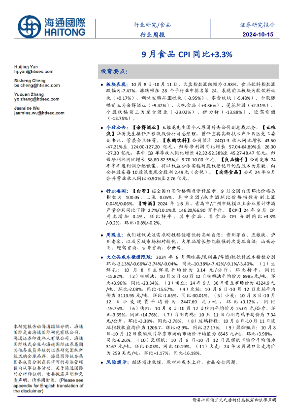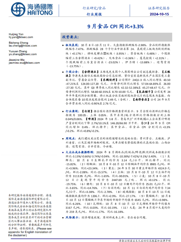 【海通国际】【20241015】20241015-海通国际-食品行业周报:9月食品CPI同比+3.3%-22页
