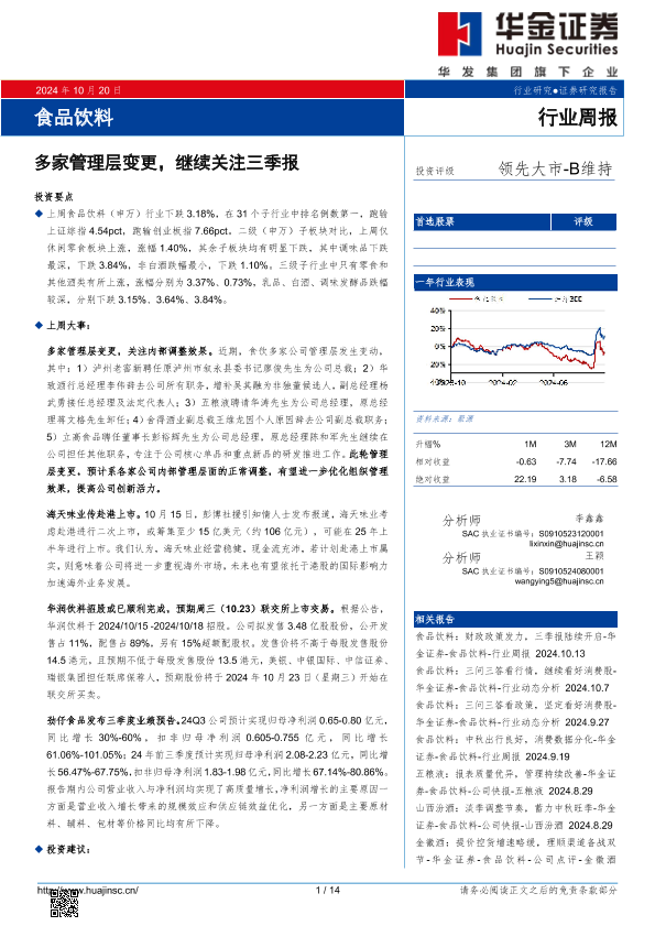 【华金证券】【20241020】食品饮料:多家管理层变更,继续关注三季报-14页