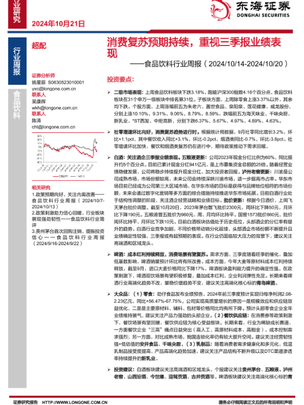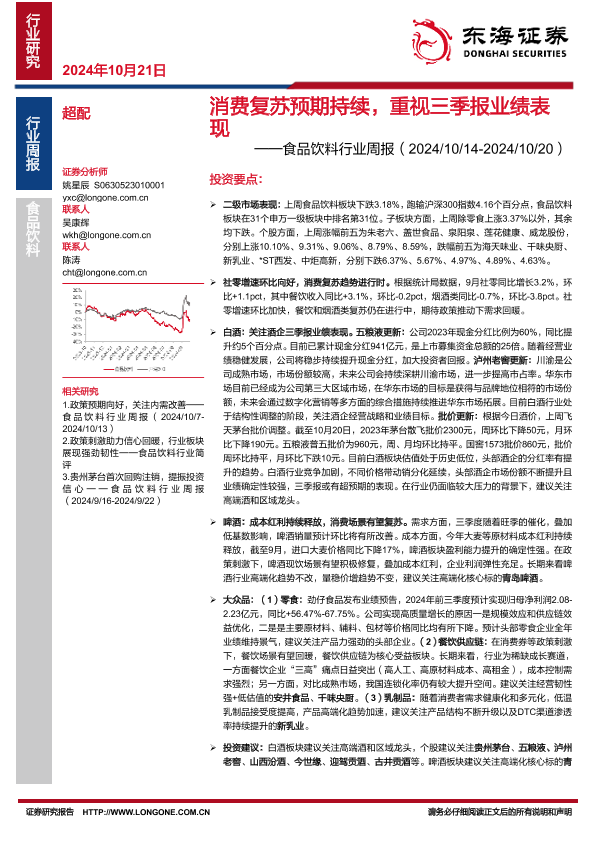 【东海证券】【20241021】20241021-东海证券-食品饮料行业周报:消费复苏预期持续,重视三季报业绩表现-11页