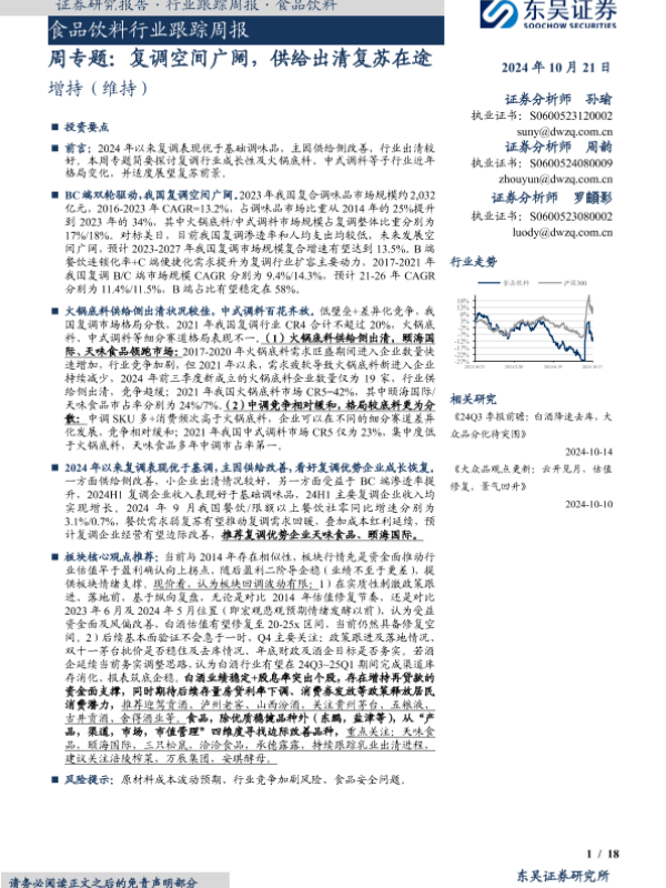 【东吴证券】【20241021】20241021-东吴证券-食品饮料行业跟踪周报:周专题:复调空间广阔,供给出清复苏在途-18页