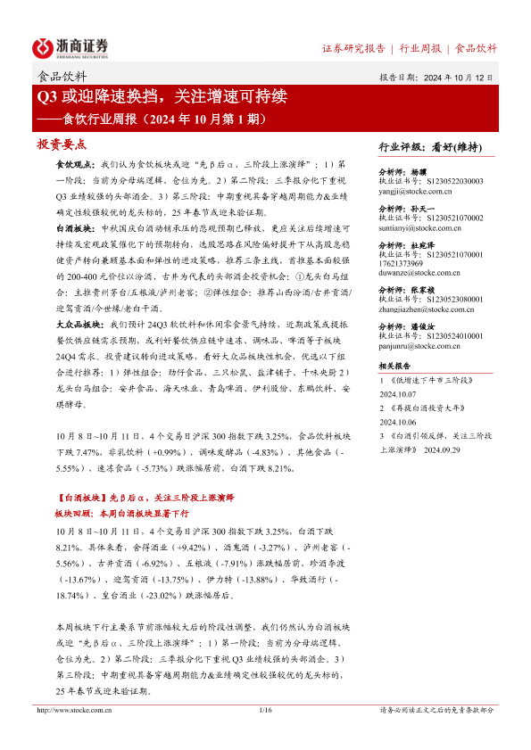 【浙商证券】【20241012】食饮行业周报(2024年10月第1期):Q3或迎降速换挡,关注增速可持续-16页