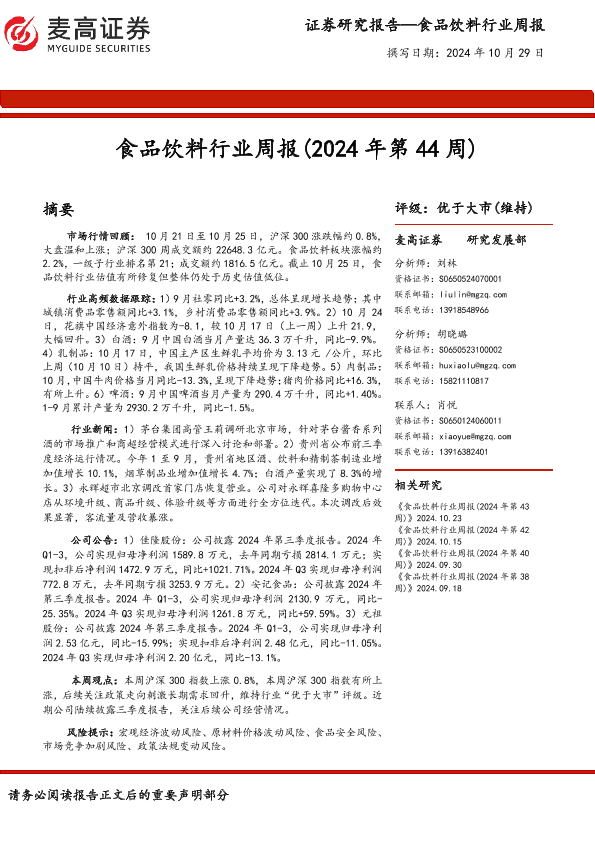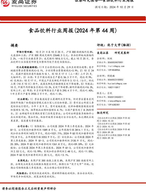 【麦高证券】【20241029】食品饮料行业周报(2024年第44周)-13页
