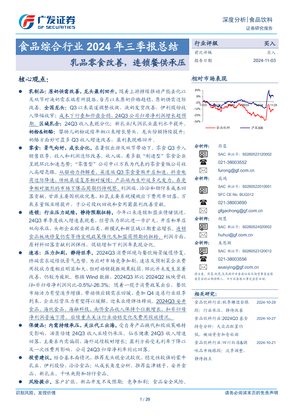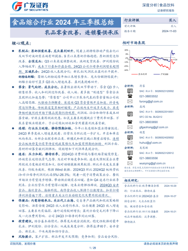 【广发证券】【20241103】食品综合行业2024年三季报总结:乳品零食改善,连锁餐供承压-29页