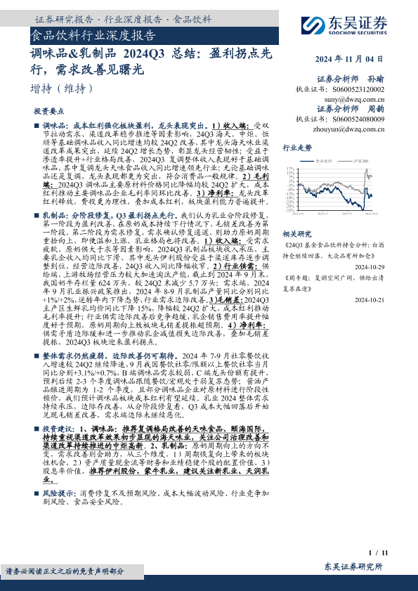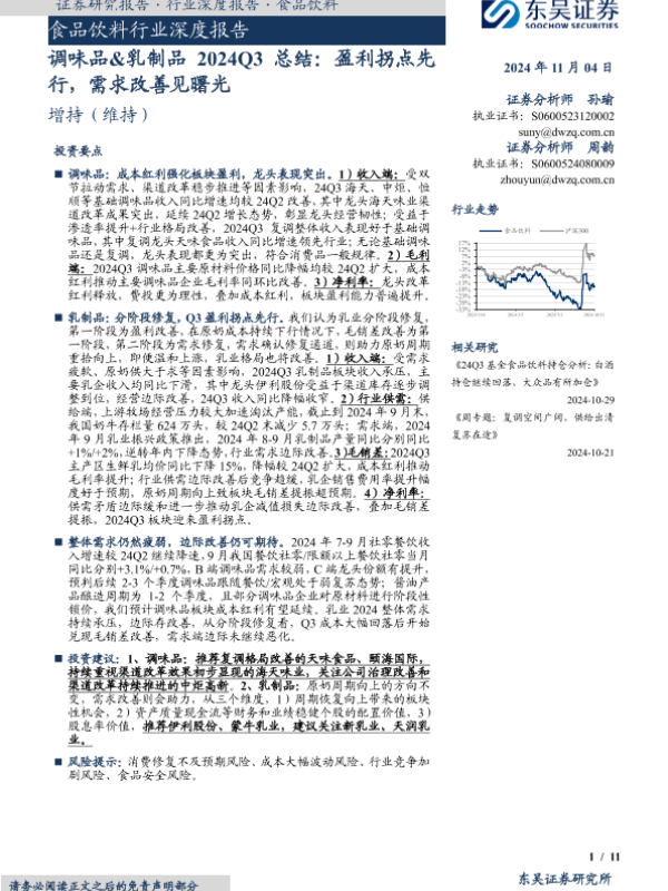 【东吴证券】【20241104】调味品&乳制品2024Q3总结:盈利拐点先行,需求改善见曙光-11页