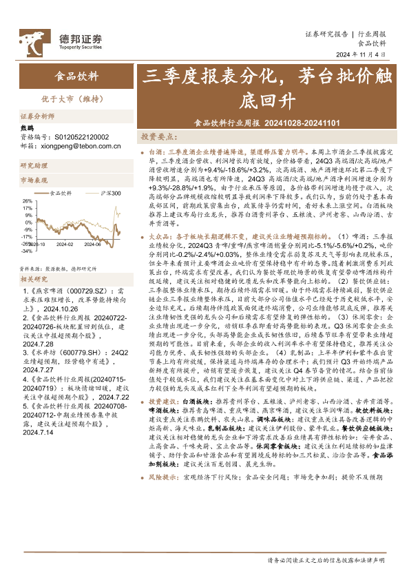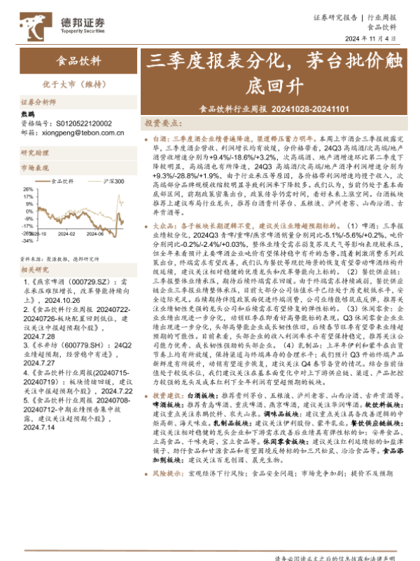 【德邦证券】【20241104】20241104-德邦证券-食品饮料行业周报:三季度报表分化,茅台批价触底回升-16页