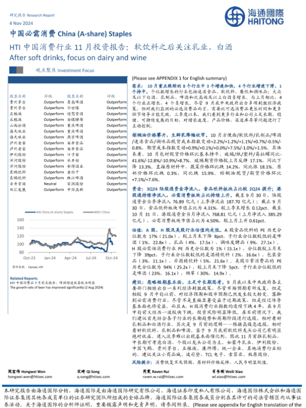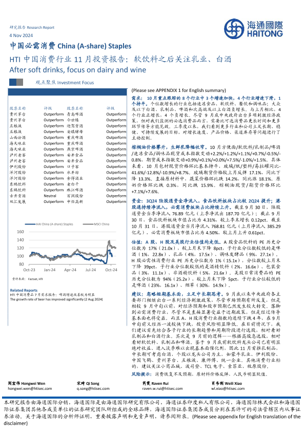 【海通国际】【20241104】HTI中国消费行业11月投资报告:软饮料之后关注乳业、白酒-48页