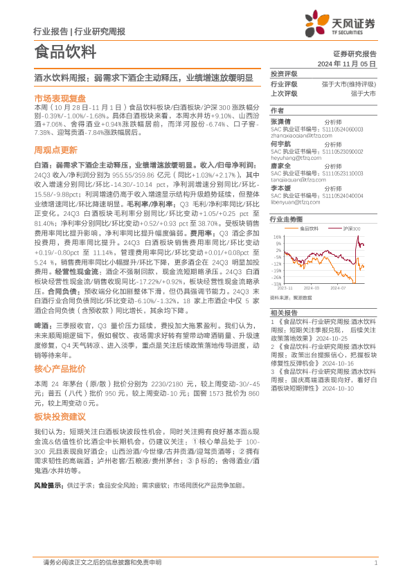 【天风证券】【20241105】20241105-天风证券-酒水饮料周报:弱需求下酒企主动释压,业绩增速放缓明显-13页