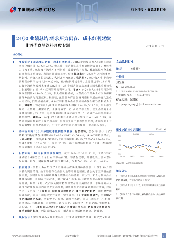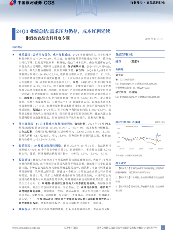 【银河证券】【20241107】20241107-中国银河-非酒类食品饮料月度专题:24Q3业绩总结:需求压力仍存,成本红利延续-17页