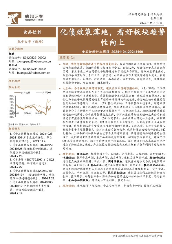 【德邦证券】【20241110】20241110-德邦证券-食品饮料行业周报:化债政策落地,看好板块趋势性向上-15页