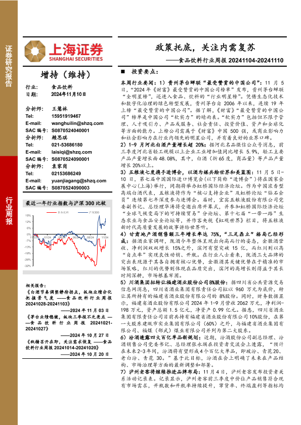 【上海证券】【20241110】20241110-上海证券-食品饮料行业周报:政策托底,关注内需复苏-20页