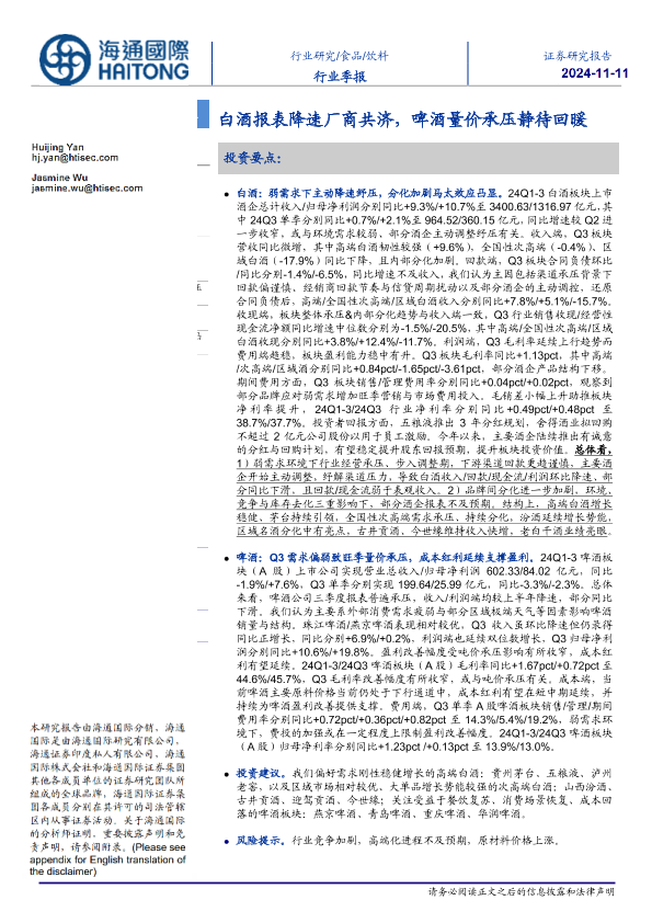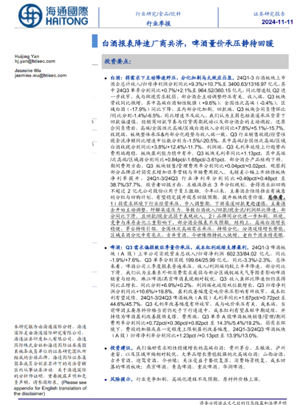 【海通国际】【20241111】20241111-海通国际-饮料行业季报:白酒报表降速厂商共济,啤酒量价承压静待回暖-27页