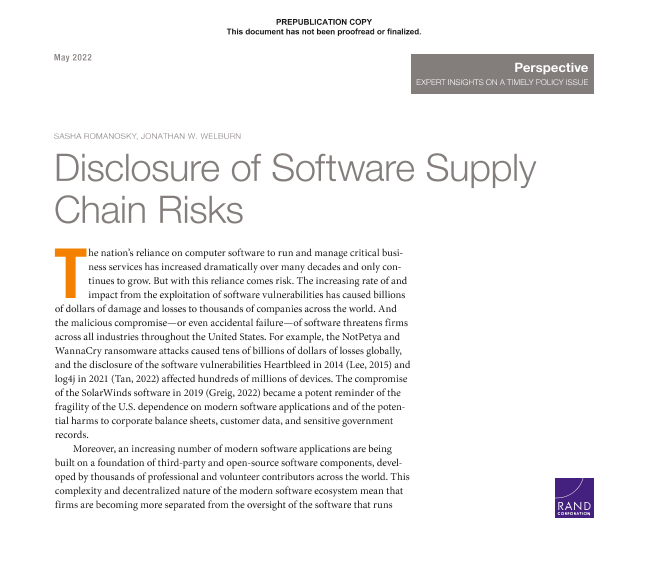 【兰德公司(RAND Corporation)】【202205】软件供应链风险披露-12页