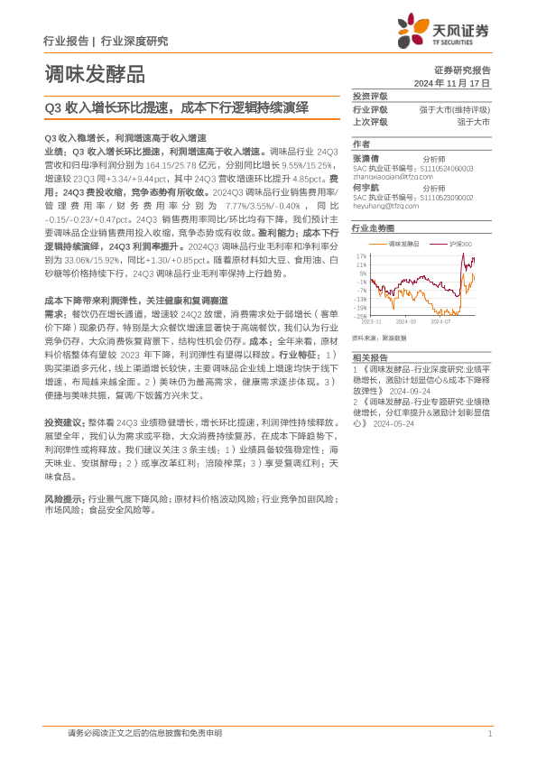 【天风证券】【20241117】调味发酵品行业深度研究:Q3收入增长环比提速,成本下行逻辑持续演绎-19页