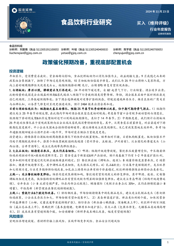 【国金证券】【20241123】20241123-国金证券-食品饮料行业研究:政策催化预期改善,重视底部配置机会-27页