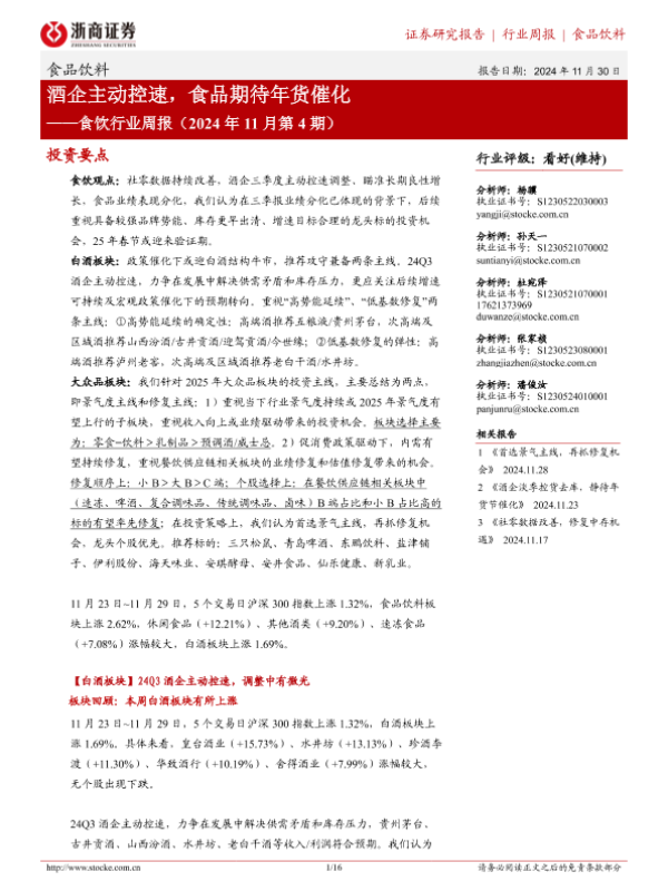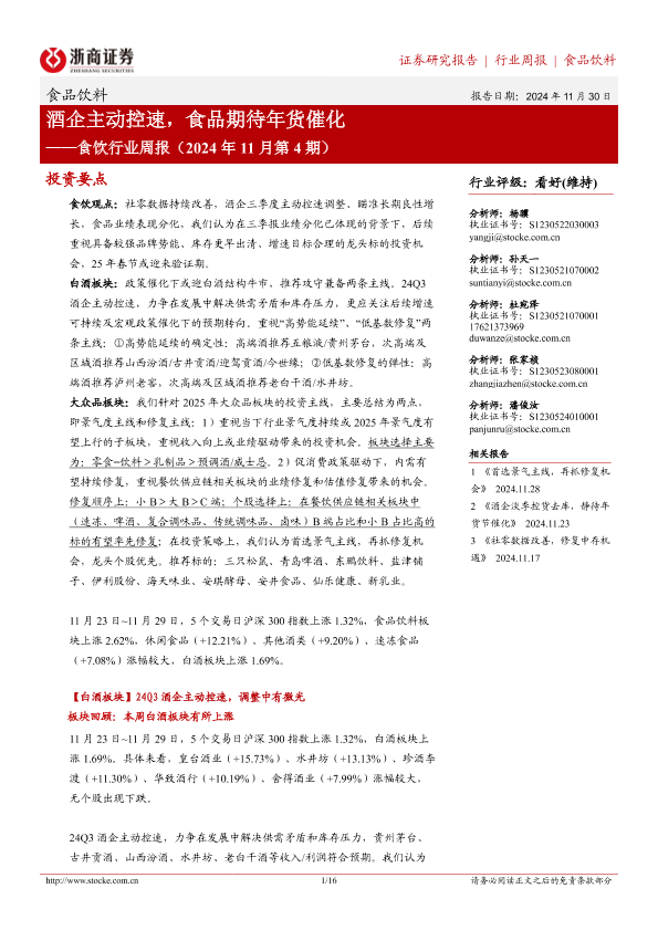 【浙商证券】【20241130】食饮行业周报(2024年11月第4期):酒企主动控速,食品期待年货催化-16页