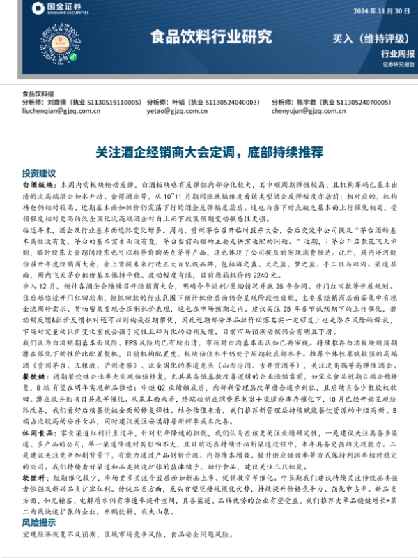 【国金证券】【20241130】20241130-国金证券-食品饮料行业周报:关注酒企经销商大会定调,底部持续推荐-10页