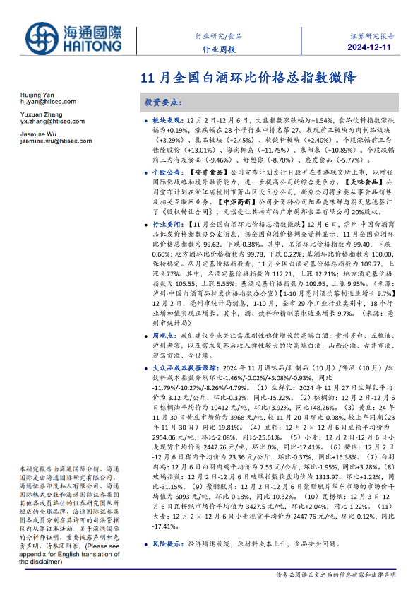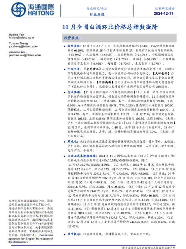 【海通国际】【20241211】20241211-海通国际-食品行业周报:11月全国白酒环比价格总指数微降-26页
