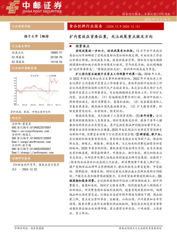 【中邮证券】【20241216】20241216-中邮证券-食品饮料行业报告:扩内需放在首要位置,关注政策重点提及方向-17页