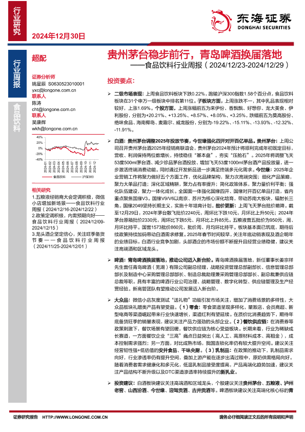 【东海证券】【20241230】20241230-东海证券-食品饮料行业周报:贵州茅台稳步前行,青岛啤酒换届落地-11页