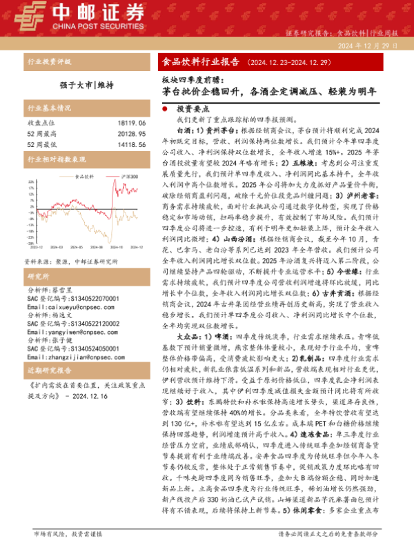 【中邮证券】【20241229】20241229-中邮证券-食品饮料行业报告:板块四季度前瞻:茅台批价企稳回升,各酒企定调减压、轻装为明年-19页