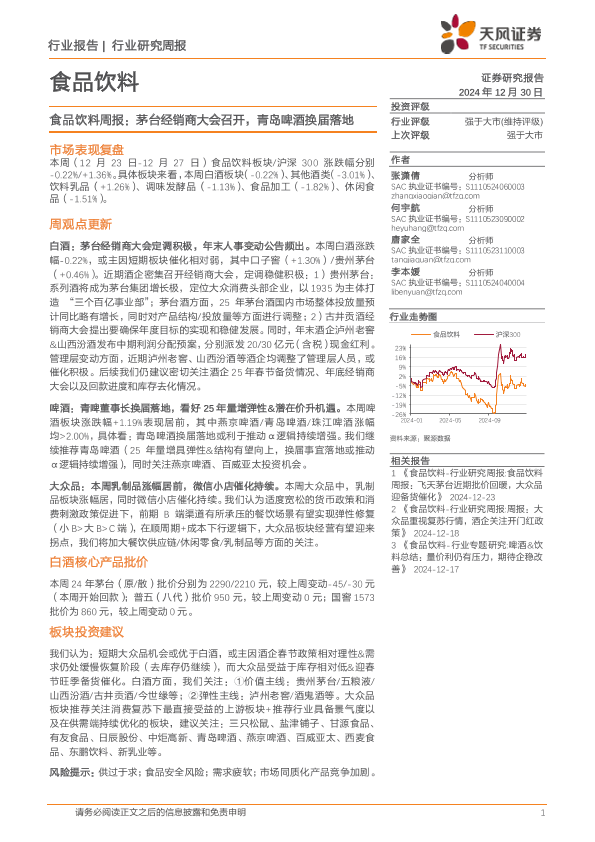 【天风证券】【20241230】食品饮料行业周报:茅台经销商大会召开,青岛啤酒换届落地-17页