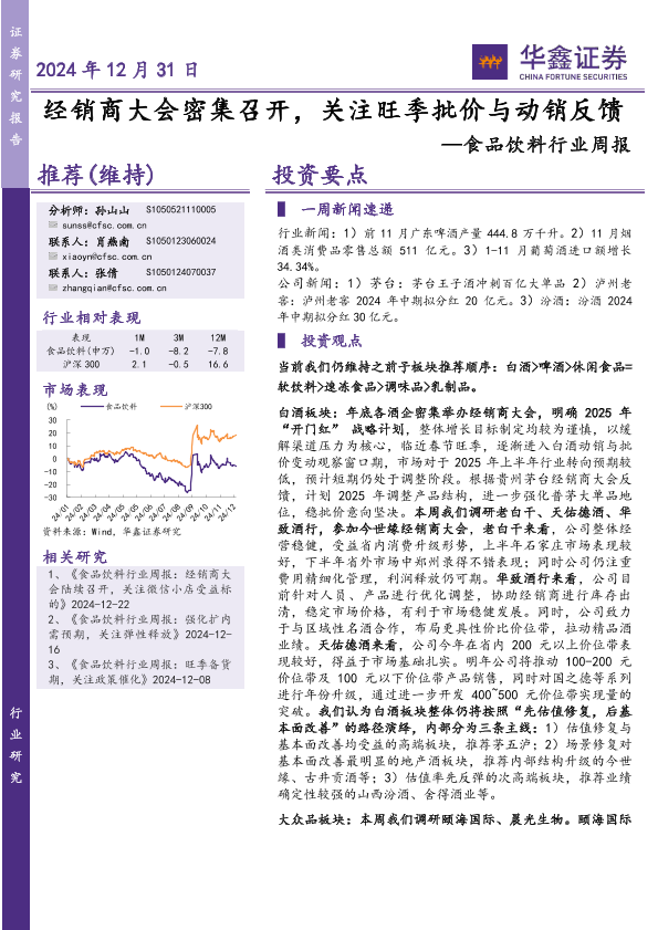 【华鑫证券】【20241231】食品饮料行业周报:经销商大会密集召开,关注旺季批价与动销反馈-19页
