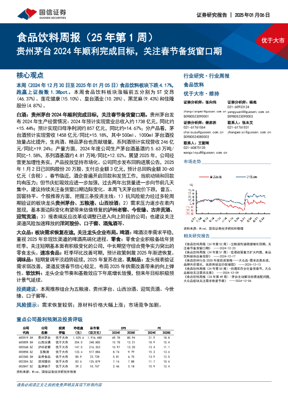 【国信证券】【20250106】食品饮料周报(25年第1周):贵州茅台2024年顺利完成目标,关注春节备货窗口期-16页