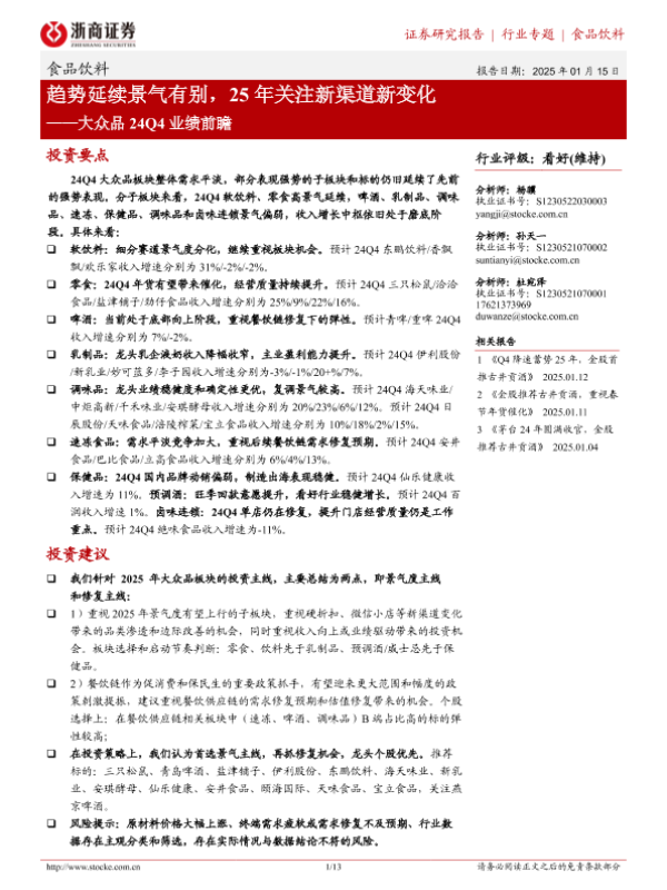 【浙商证券】【20250115】大众品24Q4业绩前瞻:趋势延续景气有别,25年关注新渠道新变化-13页