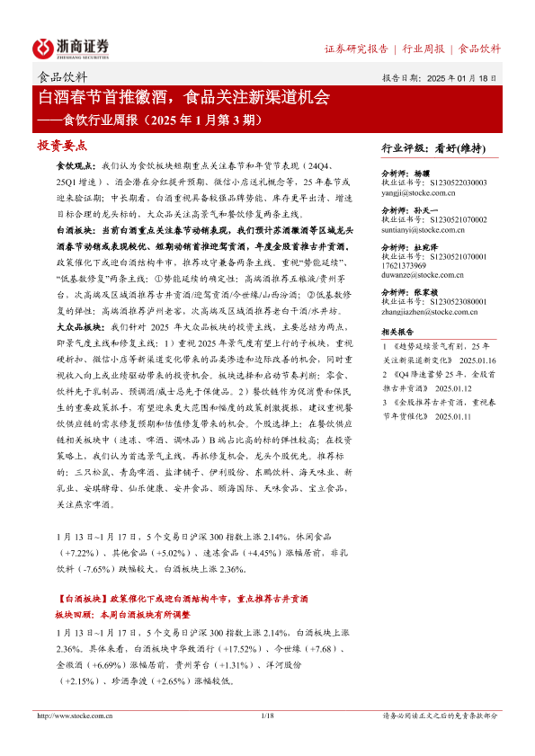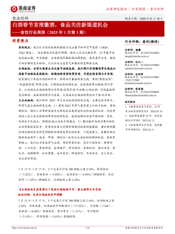 【浙商证券】【20250118】食饮行业周报(2025年1月第3期):白酒春节首推徽酒,食品关注新渠道机会-18页