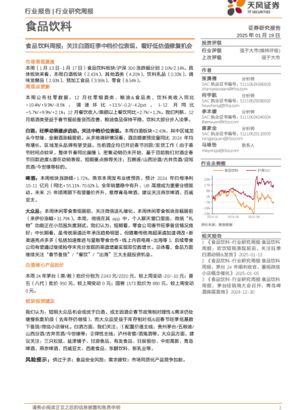 【天风证券】【20250119】食品饮料行业周报:关注白酒旺季中档价位表现,看好低估值修复机会-16页
