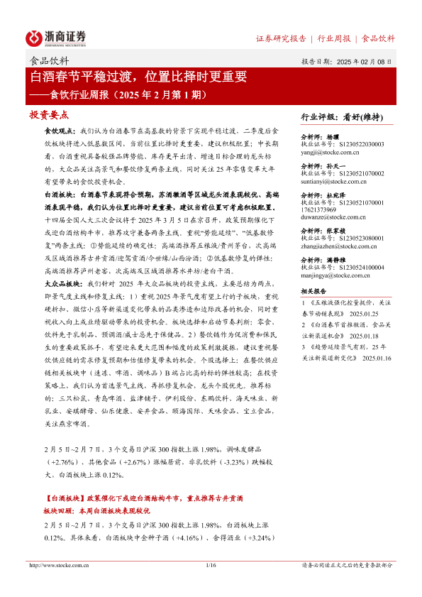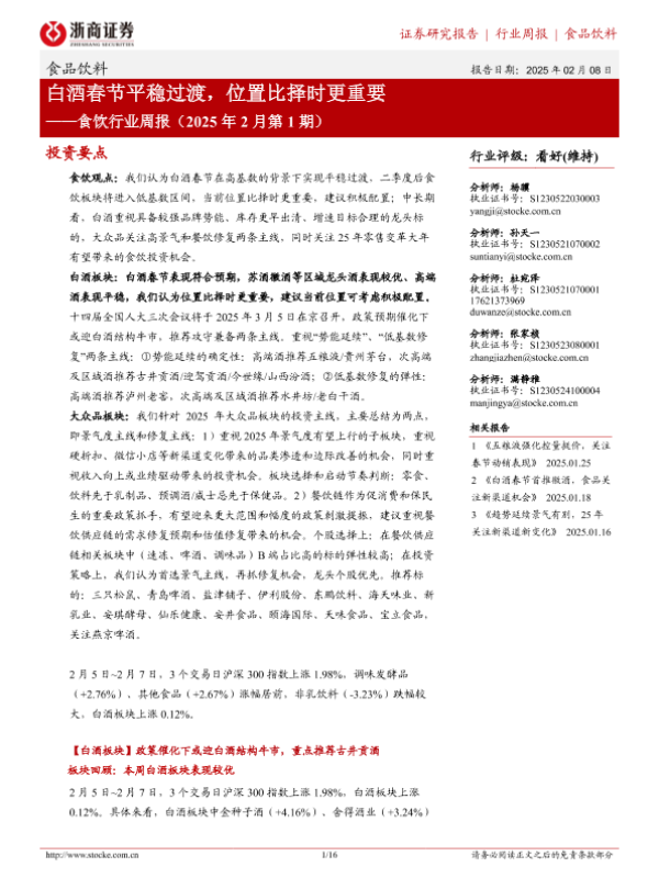 【浙商证券】【20250208】20250208-浙商证券-食饮行业周报(2025年2月第1期):白酒春节平稳过渡,位置比择时更重要-16页