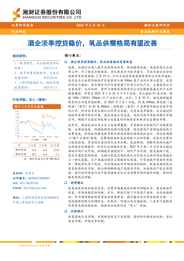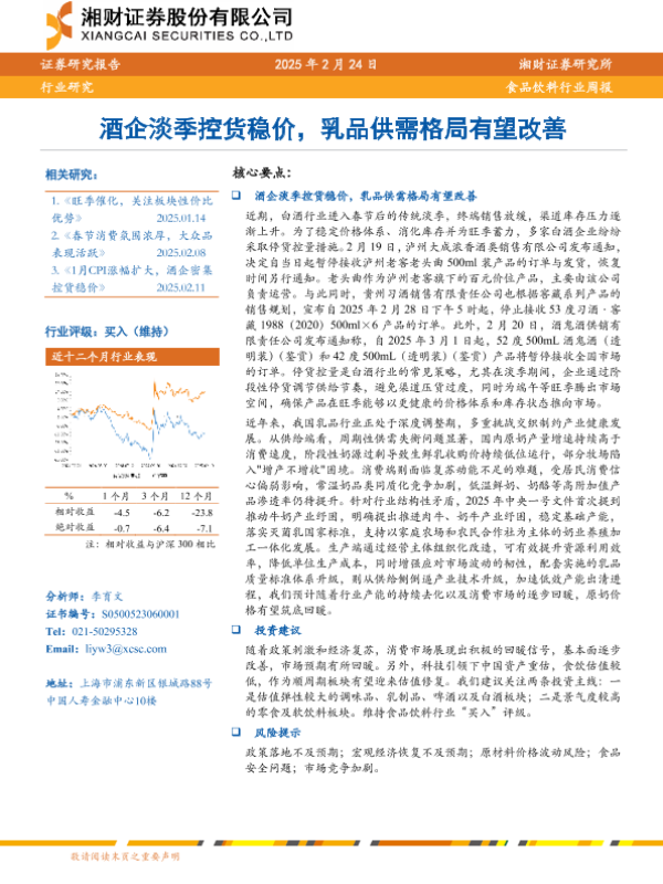 【湘财证券】【20250224】20250224-湘财证券-食品饮料行业周报:酒企淡季控货稳价,乳品供需格局有望改善-11页