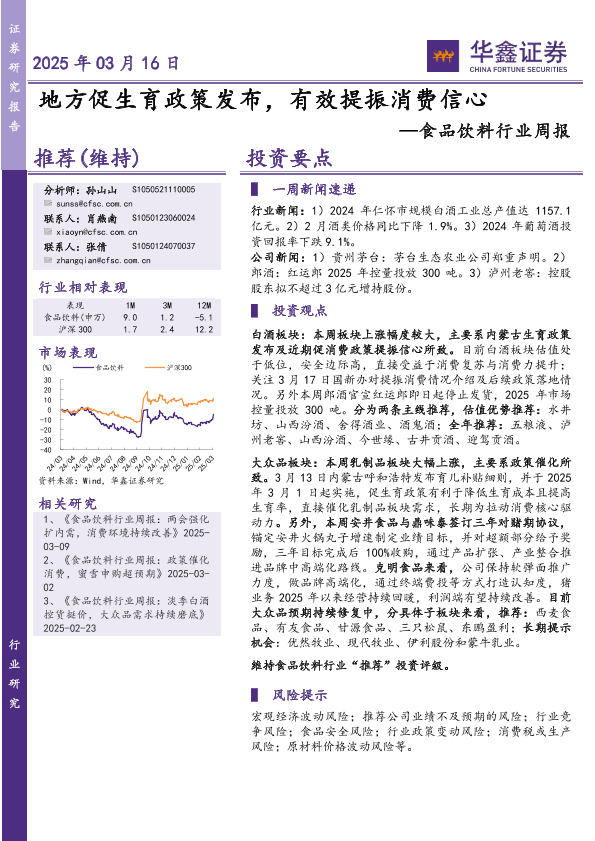 【华鑫证券】【20250316】20250316-华鑫证券-食品饮料行业周报:地方促生育政策发布,有效提振消费信心-19页