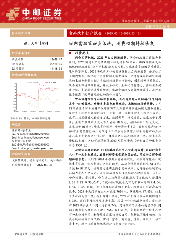 【中邮证券】【20250316】20250316-中邮证券-食品饮料行业报告:促内需政策逐步落地,消费预期持续修复-17页