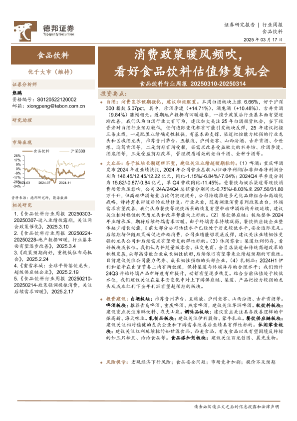 【德邦证券】【20250317】20250317-德邦证券-食品饮料行业周报:消费政策暖风频吹,看好食品饮料估值修复机会-15页