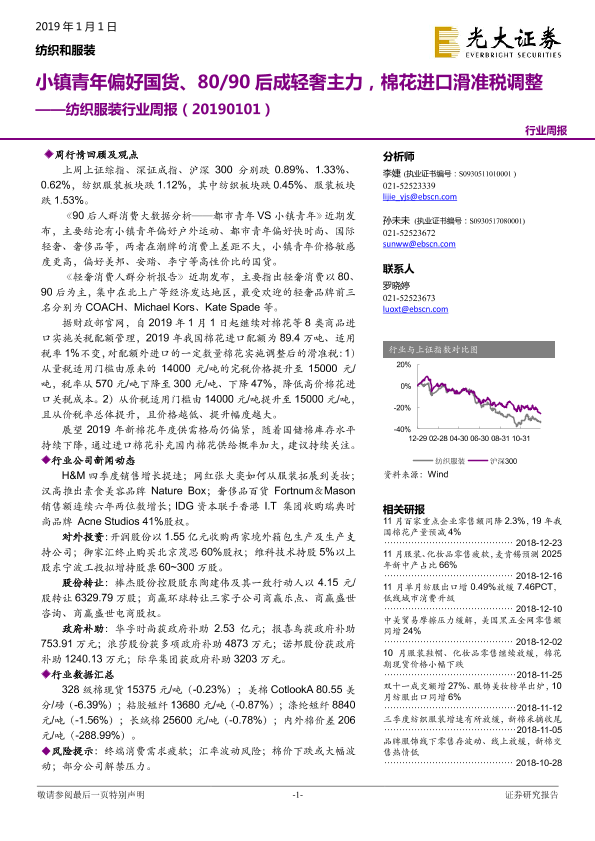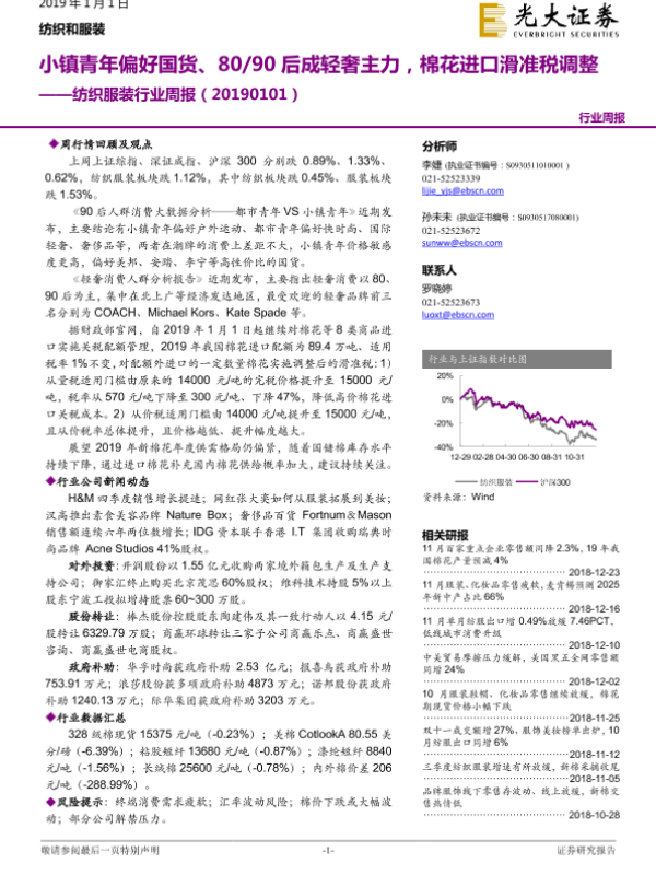 【光大证券】【20190101】20190101-光大证券-纺织服装行业周报:小镇青年偏好国货、80 90后成轻奢主力,棉花进口滑准税调整-20页