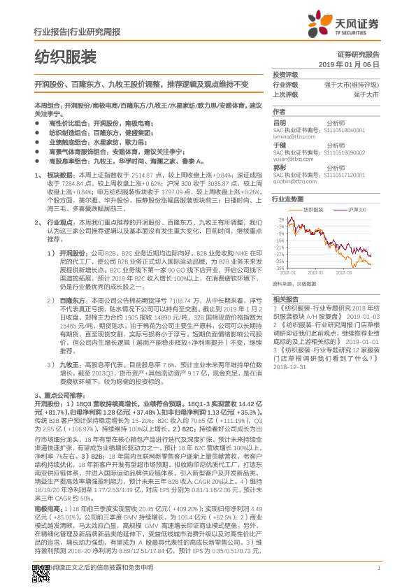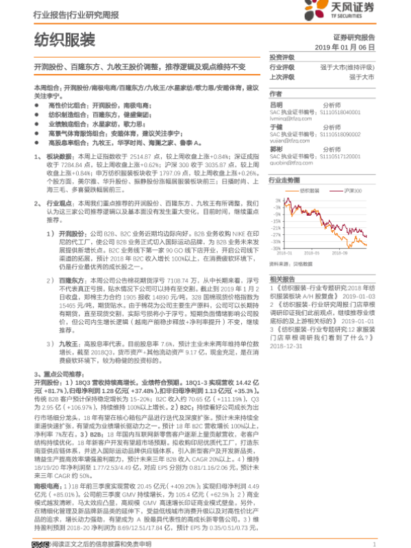 【天风证券】【20190106】20190106-天风证券-纺织服装行业研究周报:开润股份、百隆东方、九牧王股价调整,推荐逻辑及观点维持不变-18页