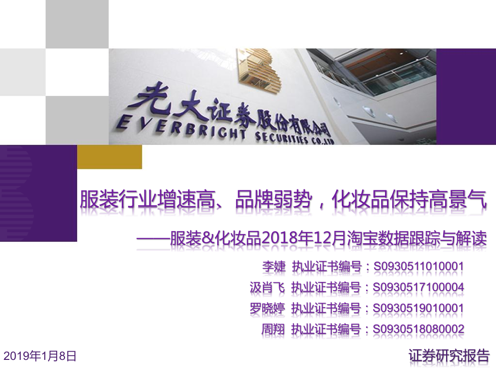 【光大证券】【20190108】服装&化妆品2018年12月淘宝数据跟踪与解读:服装行业增速高、品牌弱势,化妆品保持高景气-22页