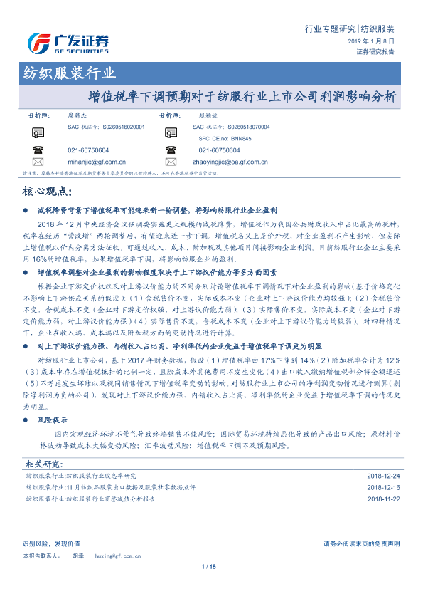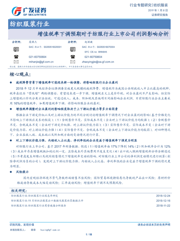 【广发证券】【20190108】增值税率下调预期对于纺服行业上市公司利润影响分析-18页