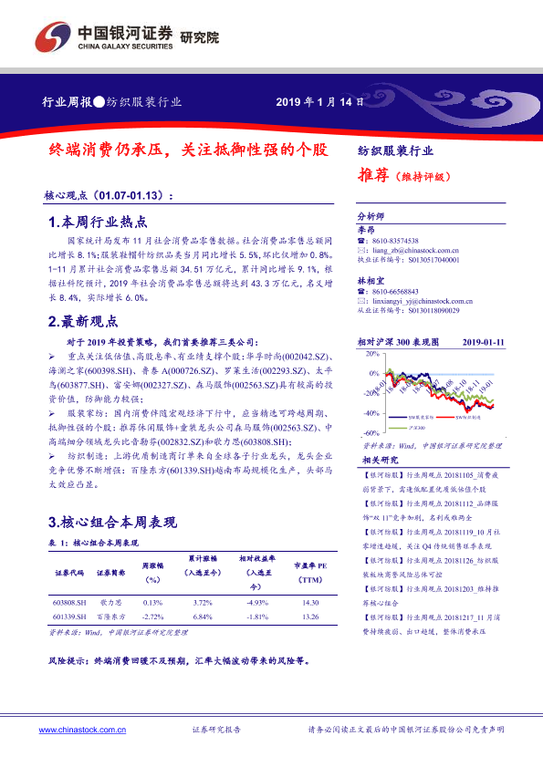 【银河证券】【20190114】20190114-中国银河-纺织服装行业周报:终端消费仍承压,关注抵御性强的个股-23页