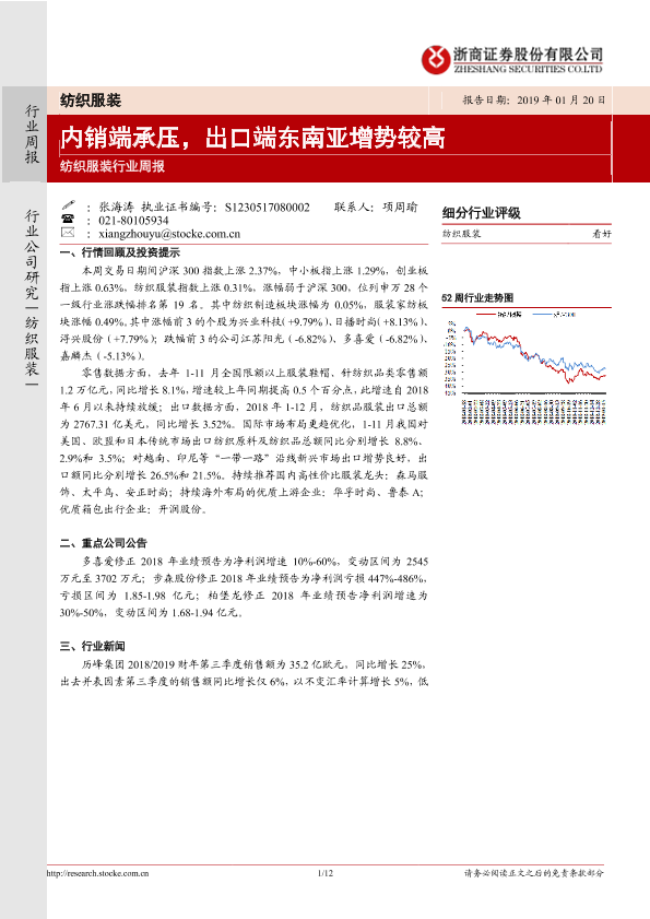 【浙商证券】【20190120】20190120-浙商证券-纺织服装行业周:内销端承压,出口端东南亚增势较高-12页