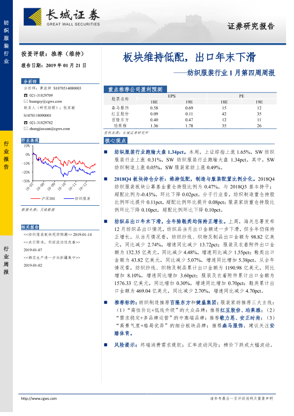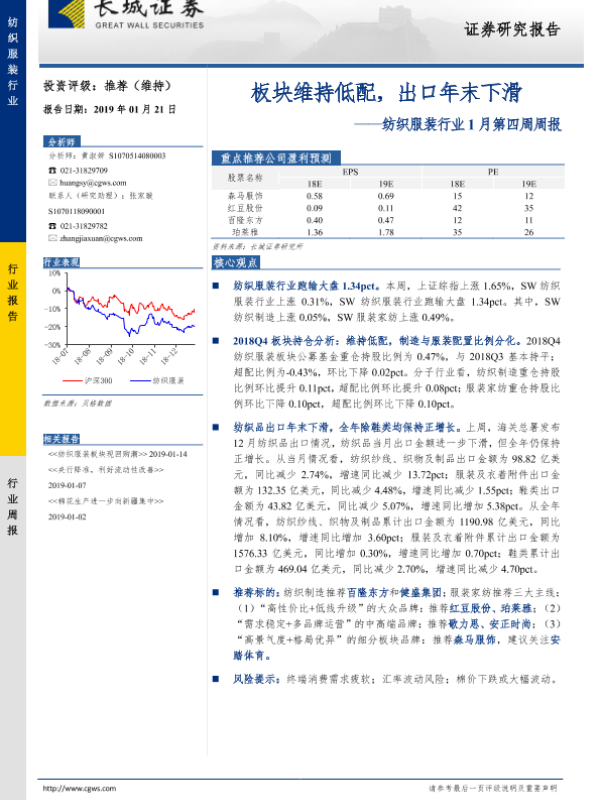 【长城证券】【20190121】20190121-长城证券-纺织服装行业1月第四周周报:板块维持低配,出口年末下滑-22页