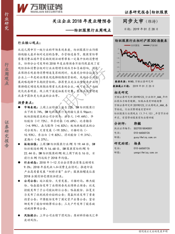 【万联证券】【20190128】20190128-万联证券-纺织服装行业周观点:关注企业2018年度业绩预告-10页