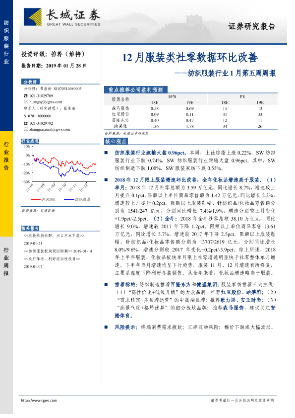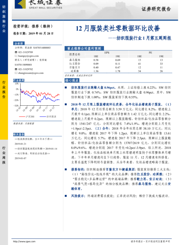 【长城证券】【20190128】20190128-长城证券-纺织服装行业1月第五周周报:12月服装类社零数据环比改善-23页