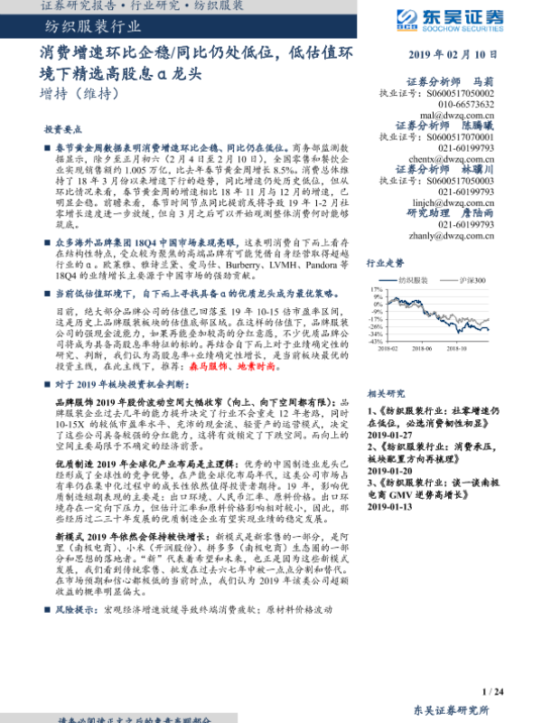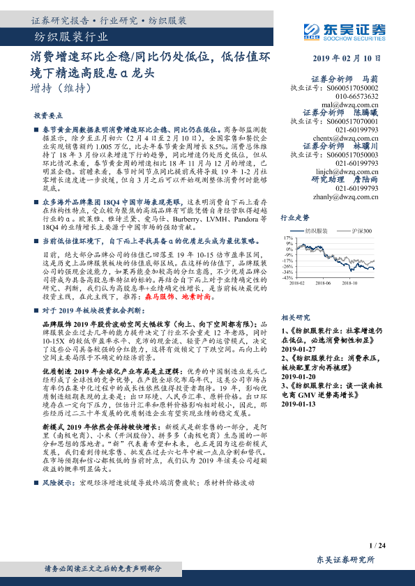 【东吴证券】【20190210】纺织服装行业:消费增速环比企稳 同比仍处低位,低估值环境下精选高股息α龙头-24页