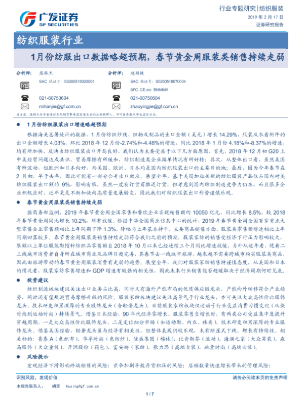 【广发证券】【20190217】1月份纺服出口数据略超预期,春节黄金周服装类销售持续走弱-7页