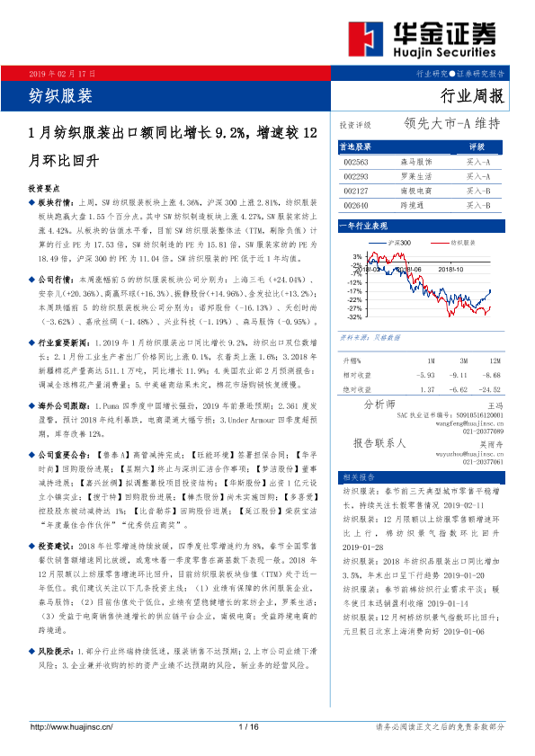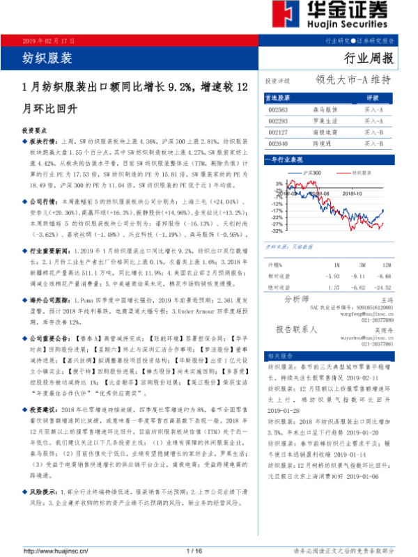 【华金证券】【20190217】20190217-华金证券-纺织服装行业周报:1月纺织服装出口额同比增长9.2%,增速较12月环比回升-16页