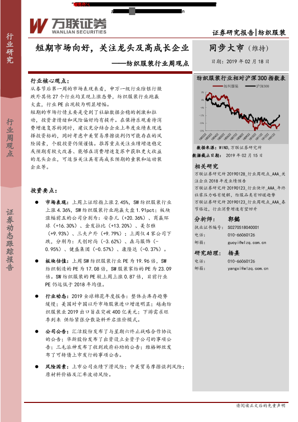 【万联证券】【20190218】20190218-万联证券-纺织服装行业周观点:短期市场向好,关注龙头及高成长企业-9页